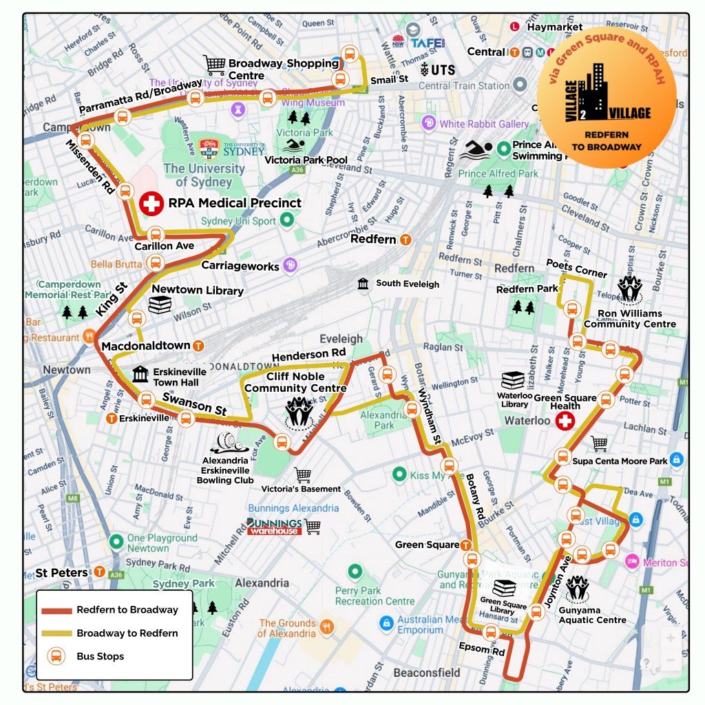 The Redfern to Broadway service aims to connect residents from Green Square, Alexandria, Erskineville and Newtown. This service started in July 2013 and is still in the developing process. Destinations of interest include: Waterloo Library, Green Square Library, Green Square Station, Erskineville Station and shops, King Street, RPA Hospital, Broadway Shopping Centre and Sydney Fish Market.