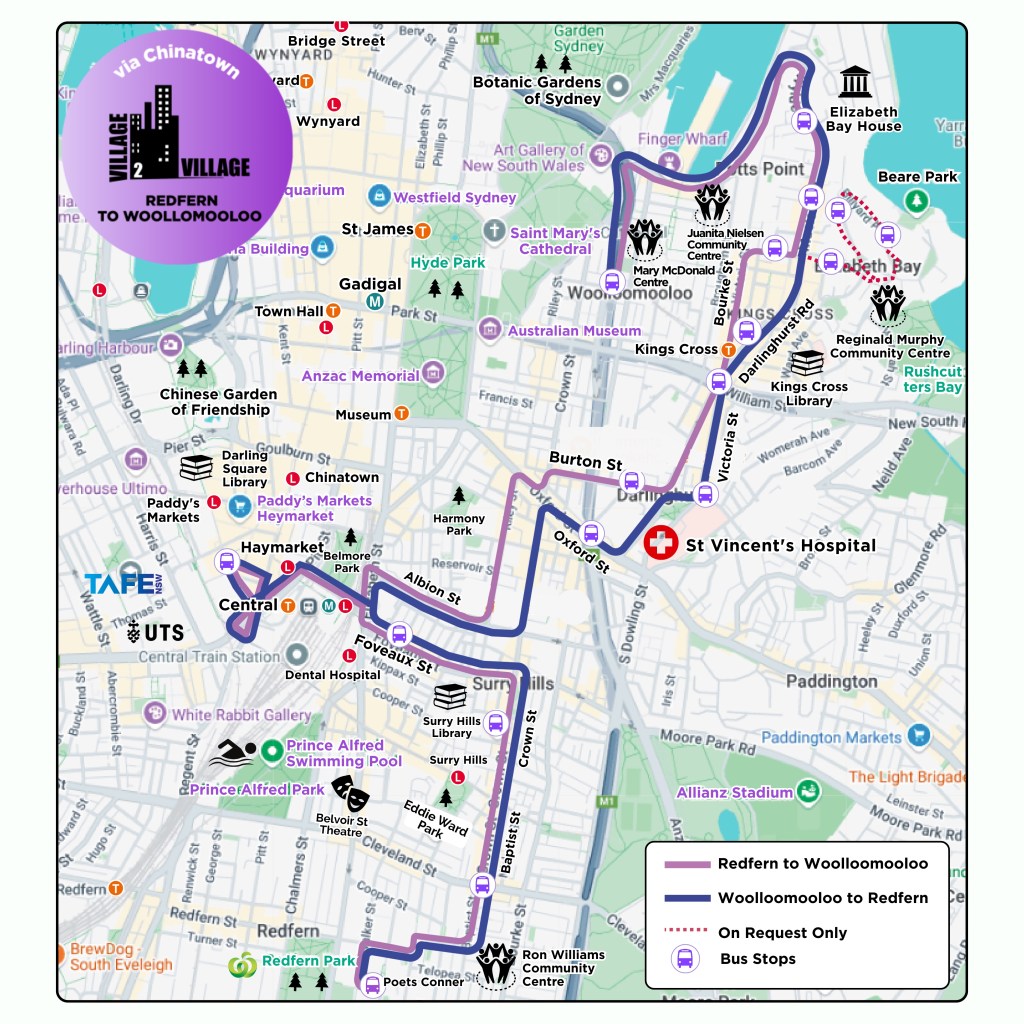 The Woolloomooloo to Redfern service started in February 2008 and links residents of Woolloomooloo, Potts Point, Darlinghurst, Surry Hills and Redfern to local services including Potts Point shops, Kings Cross Station, St Vincent’s Hospital, Paddy’s Markets, Central Station, Surry Hills shops and Redfern. It also connects to the Redfern to Glebe service.